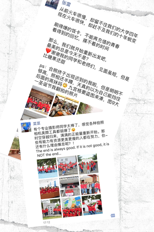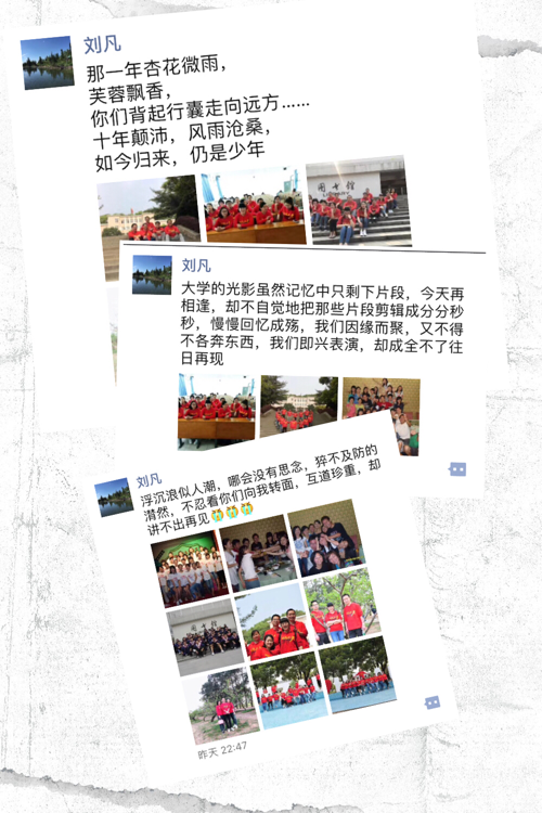 【牡丹亭】里有一出【游园·惊梦】,校友们结伴游园是为了重温旧梦,这个他们生活学习了四年的地方,有旧的回忆,也有新的发展。新校门大气恢弘;行政楼前的樱花树都长大了,花开似锦灿若云霞;广场上的喷水池依旧是大家最爱的合影圣地;图书馆120度倾斜的台阶是大家穿着学士服拍毕业照的地方,将学士帽扔向天空的那一刻仿佛就在昨天;“勤读力耕,立己达人”的校训石碑矗立在红砖石中间的绿草坪上,还是那么好看;低着头默默钻进第三教学楼的自习室,在师弟师妹们异样的眼光下拍照,照片里一双双眼睛亮晶晶的,难掩兴奋;最后,终于来到了外国语学院的长廊,仔细看着墙壁上外院老师们的介绍,熟悉的名字和面容,于是那些挂科的、改论文的、答辩的日子在心头翻涌,好一个十年!