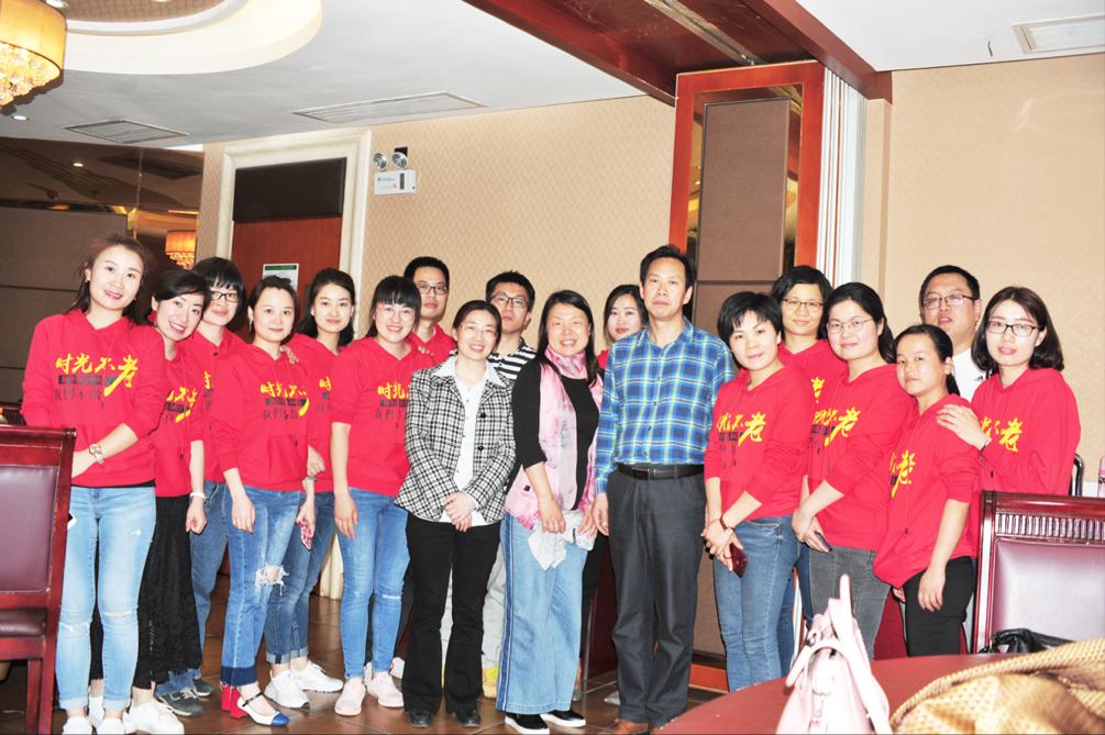 晚餐就定在校内的国际学术交流中心,这次聚会本没想惊动学院领导,只邀请了班主任方红老师,但没料到的是,因为今年正值华农120周年校庆,也是外语系成立25周年,学院领导对校友们的回校重聚很是重视。正当大家围桌而坐、促膝而谈的时候,领导们牺牲周末的休息时间,来跟大家短暂会面,院党委王平祥书记、MTI中心主任曾文华副教授跟大家聚集在一起拍照留念,并在特别为聚会制作的横幅上签字。至此,掀起了聚会的另一个高潮。