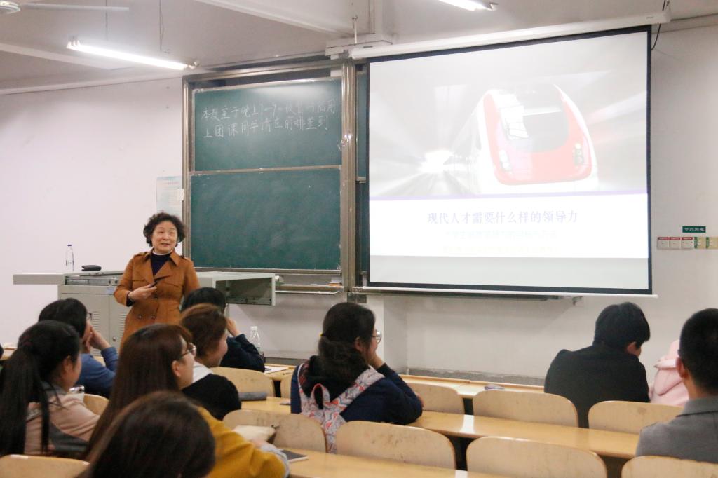 夏纪梅老师用一幅火车头的图画引出了今天团课的主题—领导力。并接连向同学们抛出了:大家有没有当过领导?同学们觉得领导力的力包含哪些力?等一系列问题,并巧妙地运用同学们熟悉的专业知识帮助在座的同学们打开思维,配合其本人风趣幽默的语言,让原本严肃肃静的会场氛围变得生动有趣。接着,夏纪梅老师从领导力的概念、领导力的标准、领导力的培养以及大学生所需要的领导力四个方面,向同学们阐释了大学生应如何看待领导力以及如何确定目标,从而找到适合自己的方法这一具体问题。她提到,领导力的形成不仅仅依靠学历这方面的硬实力,同时还要求领导者拥有智商、情商、逆商、生存商等软实力。