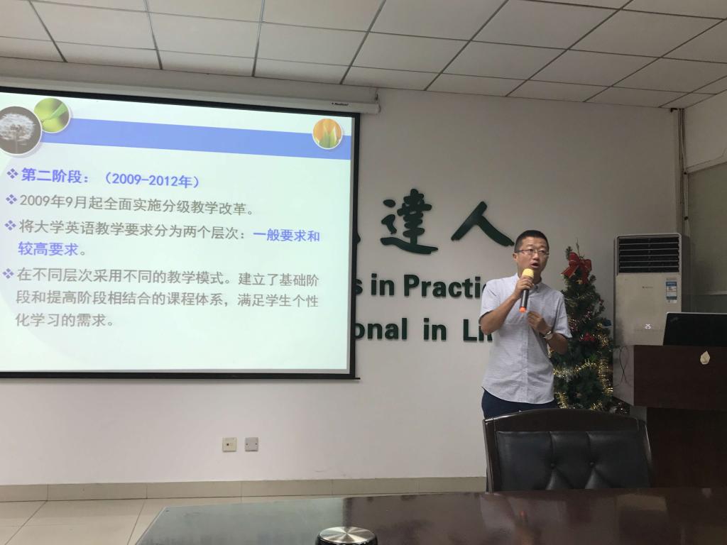 曾红霞副院长就深化大学英语教学改革提出了几点思考。她以大学英语教学中存在的一些突出问题入手,阐明了人文素养的厚度决定未来发展的高度,今后的教学中要着力加强华农学子国际交流的能力与水平,要千方百计的让大学英语与我校优势学科相结合,提出了以学生为中心、终生学习等教学理念与目标,指出教师要不断提升教学能力,改进教学评价机制,深入推进大学英语教学改革。