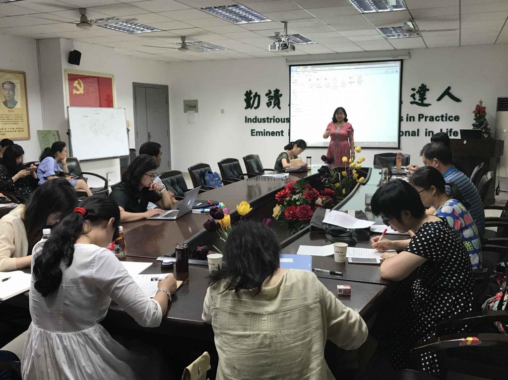 此次研讨首先由代表进行专题发言。大学英语部主任张瑞嵘对大学英语分级教学改革十年来的三个阶段进行了回顾,分析了改革中面临的分级教学如何体现差异化和个性化、学生自主学习中教师如何加强引导和监督、后续课程如何与专业知识和优势学科相结合等问题,提出了改进和提升大学英语教学的构想。大学英语部副主任王菲就构建大学英语教学一流师资和一流课堂的问题进行了深入的阐述,认为只有切实提升大学英语教师的教学科研水平,才能打造大学英语一流的课堂教学。胡素芬老师的发言强调大学英语教学应当根据学生的需求进行个性化教学,在“双一流”战略背景下,应着力培养学生的英语语言能力和跨文化交际能力,特别对于我校这样的研究型重点大学,培养学生的学术英语能力也是大学英语重要的教学目标。