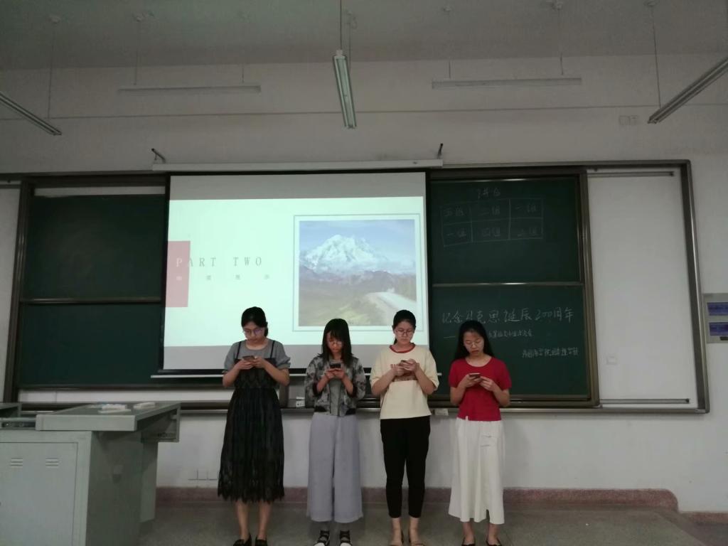 6月10日19时,外国语学院理研会第四次小组讨论会在四教C103教室举办。这次小组讨论会由外国语学院理论学习部部长冯逸舟主持,主题为“纪念马克思诞辰200周年”。讨论会的安排共分为三个部分,分别为观看《朗读者》视频、各小组为大家朗读马克思的作品选段、观看《不朽的马克思》纪录片。