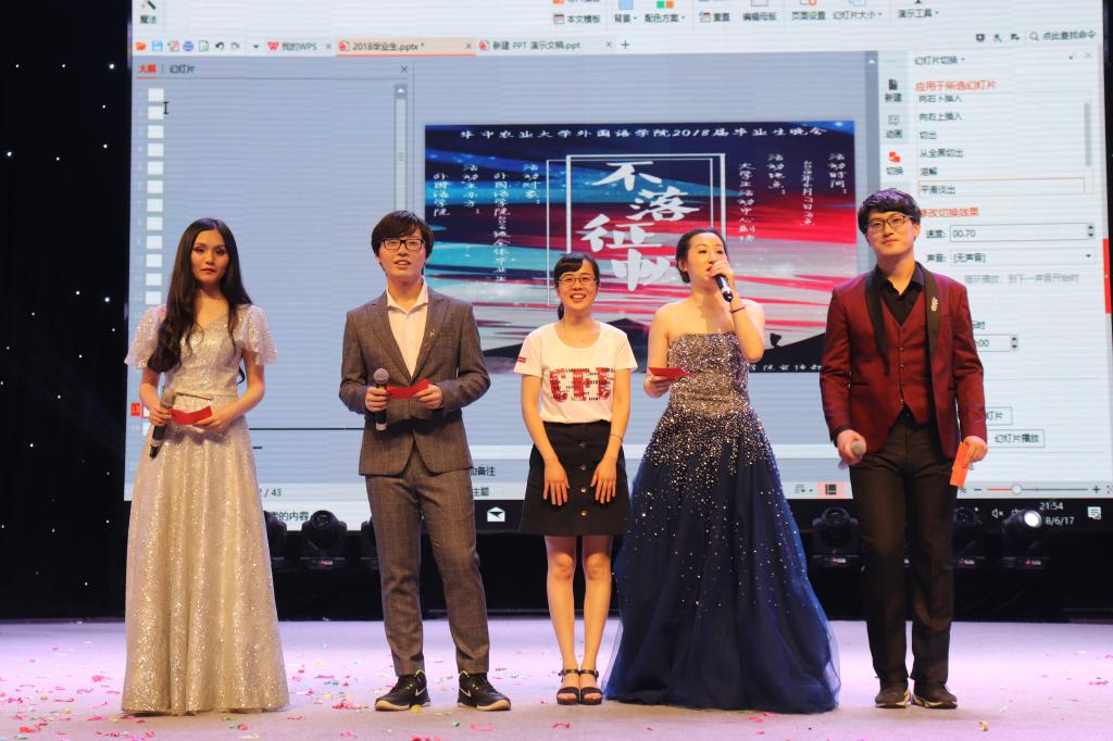 接下来便是晚会的惊喜环节,王书记、杨书记、赵平老师、范琼老师和曾毅老师等学院老师通过视频向毕业生表达了最真挚的祝福。“我们现在正处于人生中最美好的时候,时代给予我们很多机会,所以我真心的希望大家,要始终坚持心中的一把火,不要怨天尤人,不要妄自菲薄,不要悲观失望,要积极学习、参与、合作,不断地创造,在将来人生的星辰大海中展翅翱翔。祝大家前途似锦。”这是王书记送给毕业生的祝福和期望,希望他们将人生描绘得更加精彩。杨书记则告诉大家:“成长就是不断地接受,接受突如其来,接受不知所措,接受事与愿违,所以我愿你们跌倒人生低谷时,还能从容相信;愿你们谈到生活不易时,还能善待自己;愿你们在看清事实真相后,依然热爱生活。”最后,杨书记用一曲《离歌》表达了自己对毕业生的不舍与祝福。“这里有你们永远的外国语学院,有爱你们的Mrs.赵。”“亲爱的同学们,再见了,愿大家生活幸福,前程似锦。”……