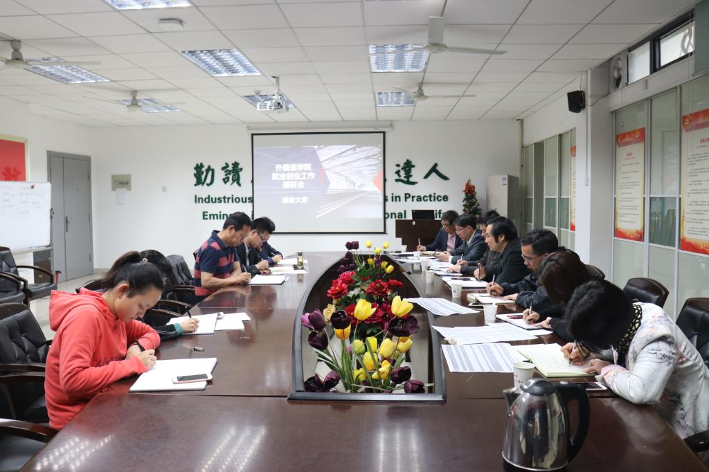 4月25日下午,校党委常委、校长助理王从严和学工部、研工部、教务处负责人走访我院,就2018届毕业生就业创业工作进行专题调研。外国语学院就业工作领导小组成员参加了此次调研。
